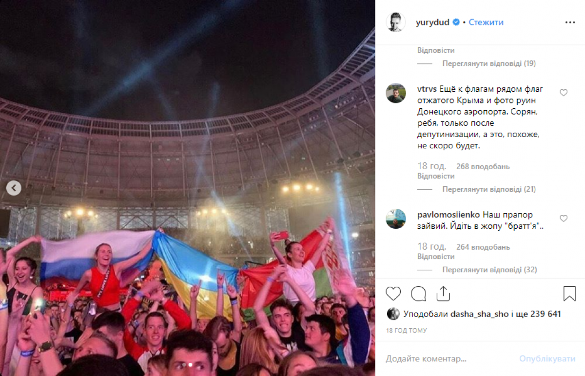 И если у белорусов, которых, надо отметить, на концерте было большинство, спрашивать нечего – это их артист, их самоидентификация и их проблемы – то украинцам, особенно тем, кто решил, что гениальным решением будет пойти на концерт, или на марш за день до, с флагом Украины или в одежде с патриотической символикой.